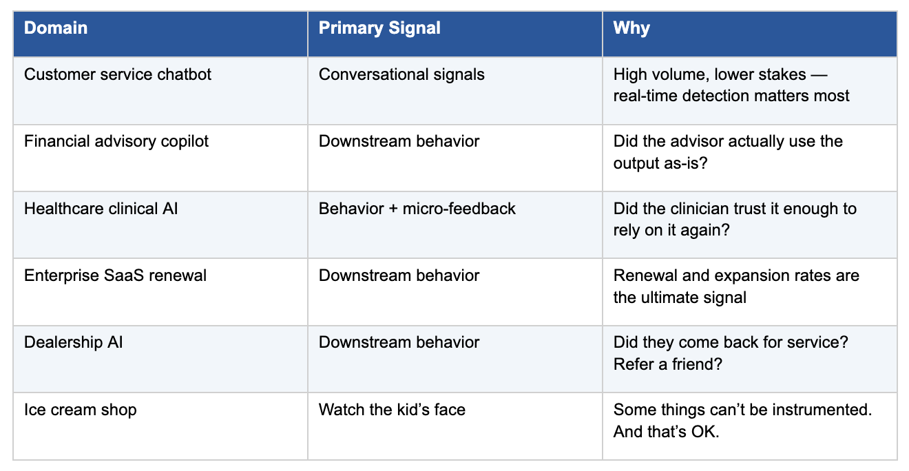 Downstream behavior (lagging, strongest). Did the user come back? Did the advisor send the proposal without rewriting? Did the doctor follow the suggestion on the next patient too? Closest to ground truth, but requires instrumenting beyond the conversation.