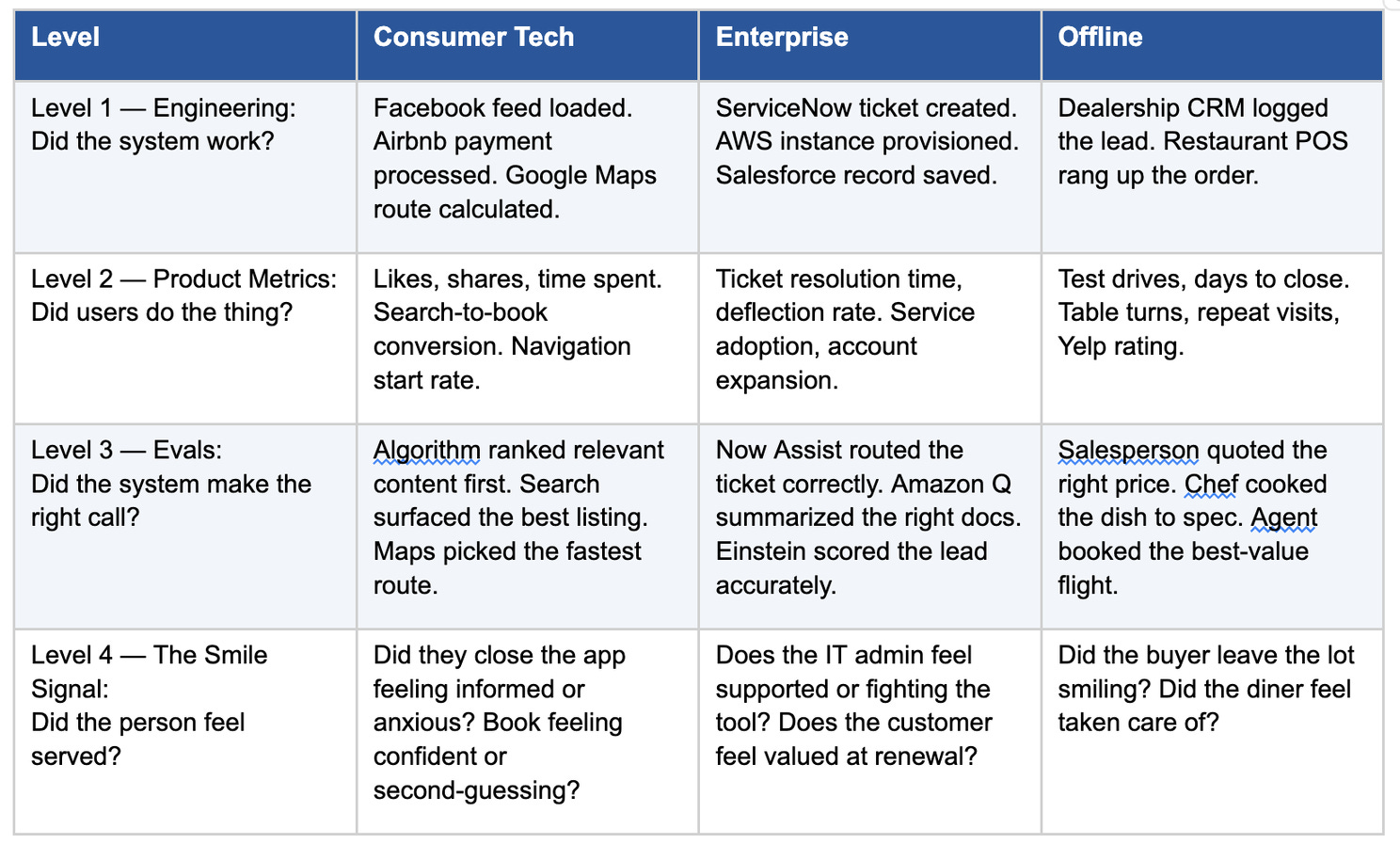The ice cream shop. No dashboard. No evals. The owner watches the kid’s face. Did the kid smile? Are they tugging their parent’s arm saying “can we come back tomorrow?” That’s the purest Smile Signal — unmeasurable, and yet the most powerful retention signal there is.