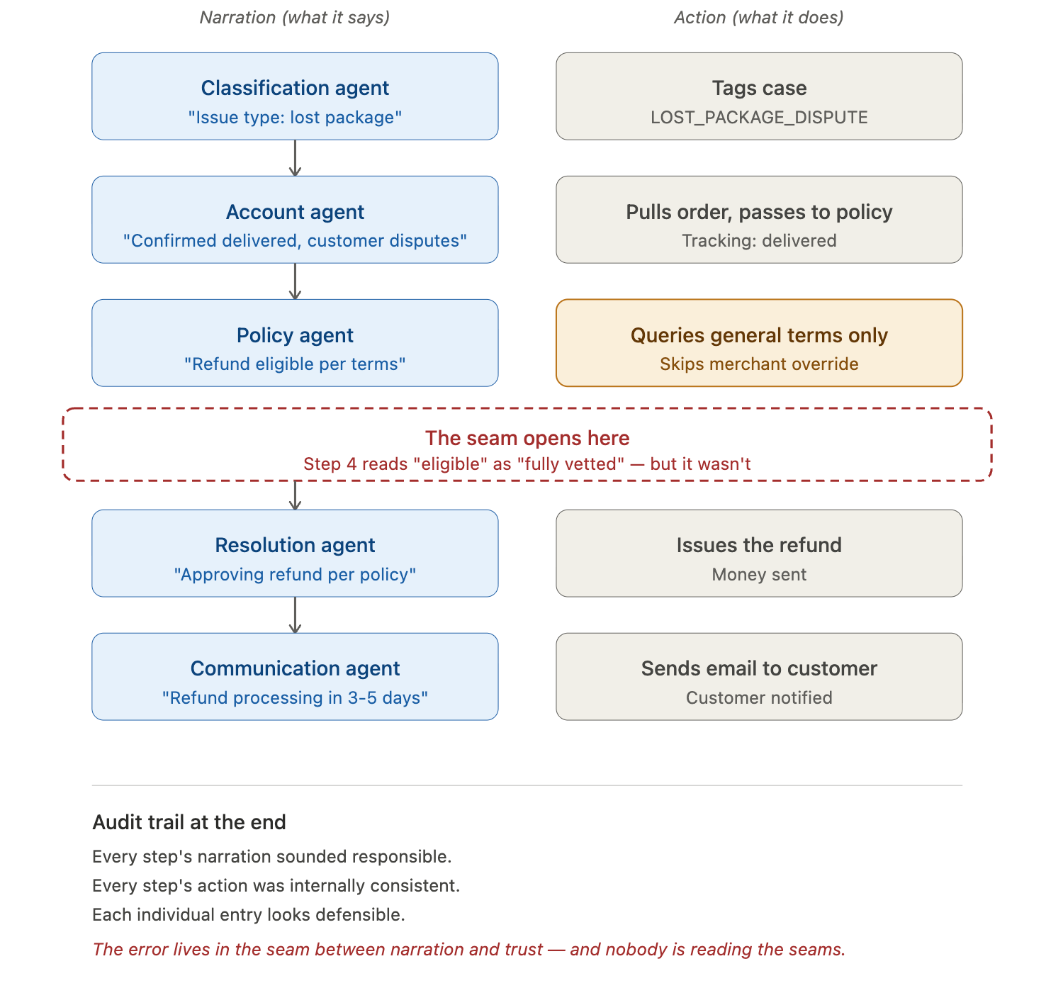 The mechanism: each agent’s narration sounded responsible. Each agent’s action was internally consistent. The error was in the seam between the policy agent’s narration (”eligible per terms”) and what the resolution agent treated that narration as (”therefore approved”). The narration said eligible. The action assumed eligible meant the case has been fully vetted. The audit trail is clean at every step. Nobody can point at where it broke.